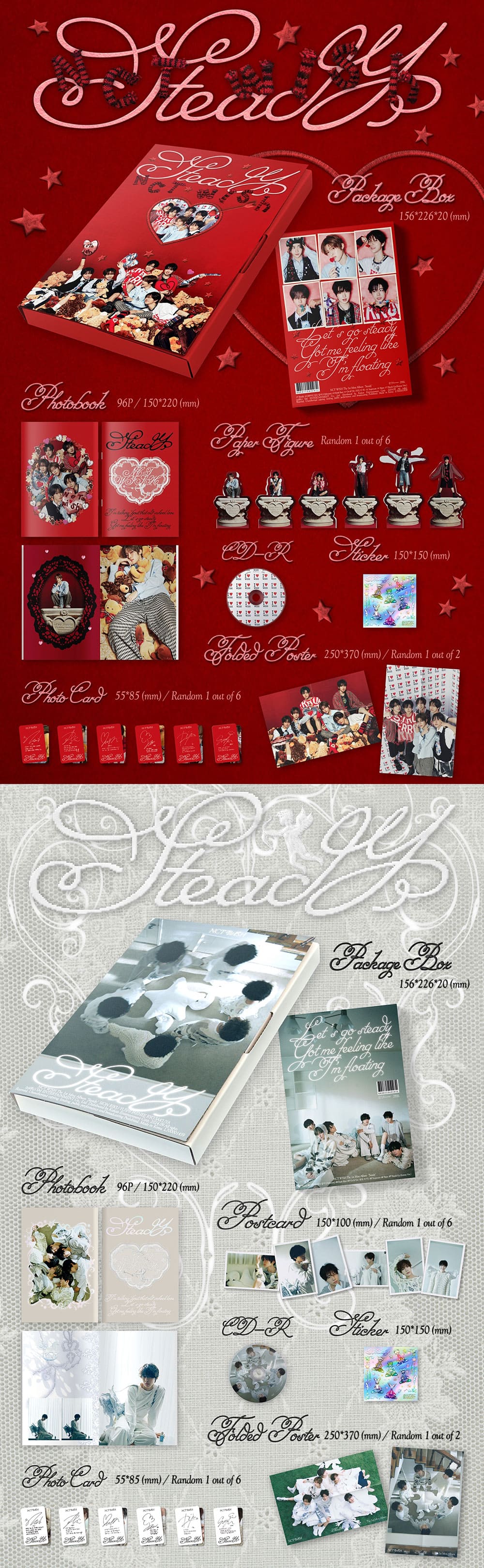 NCT WISH 첫 미니앨범 ‘Steady’는 동명의 타이틀 곡 ‘Steady’를 비롯해 선공개 곡 ‘Dunk Shot’, 프리 데뷔곡 ‘Hands Up’ 한국어 버전 등 총 7곡으로 구성되어, NCT WISH의 한층 다채로워진 음악 색깔을 만나기에 충분하다.